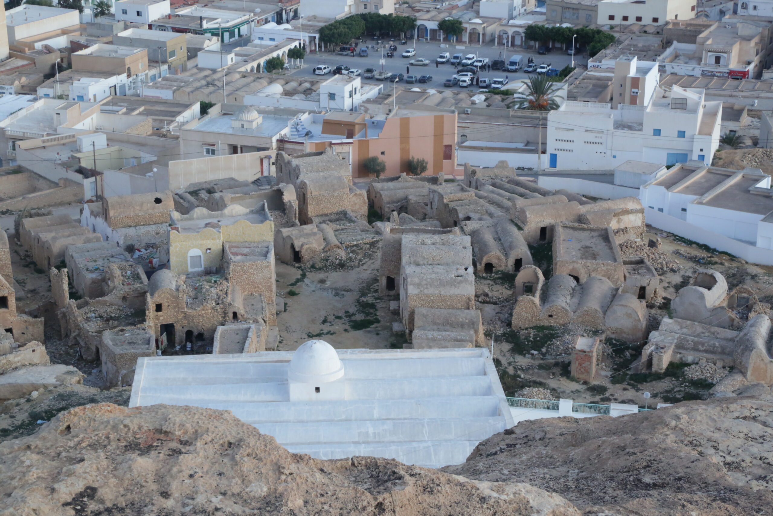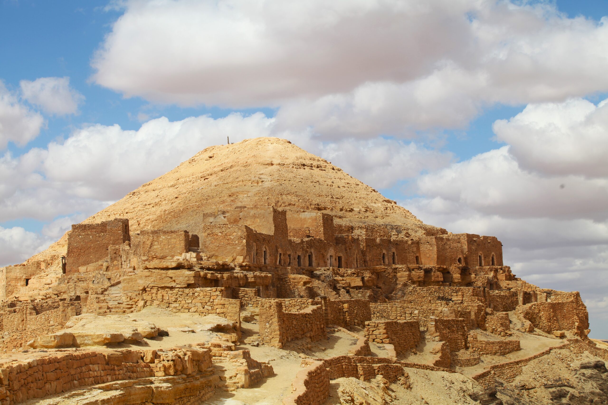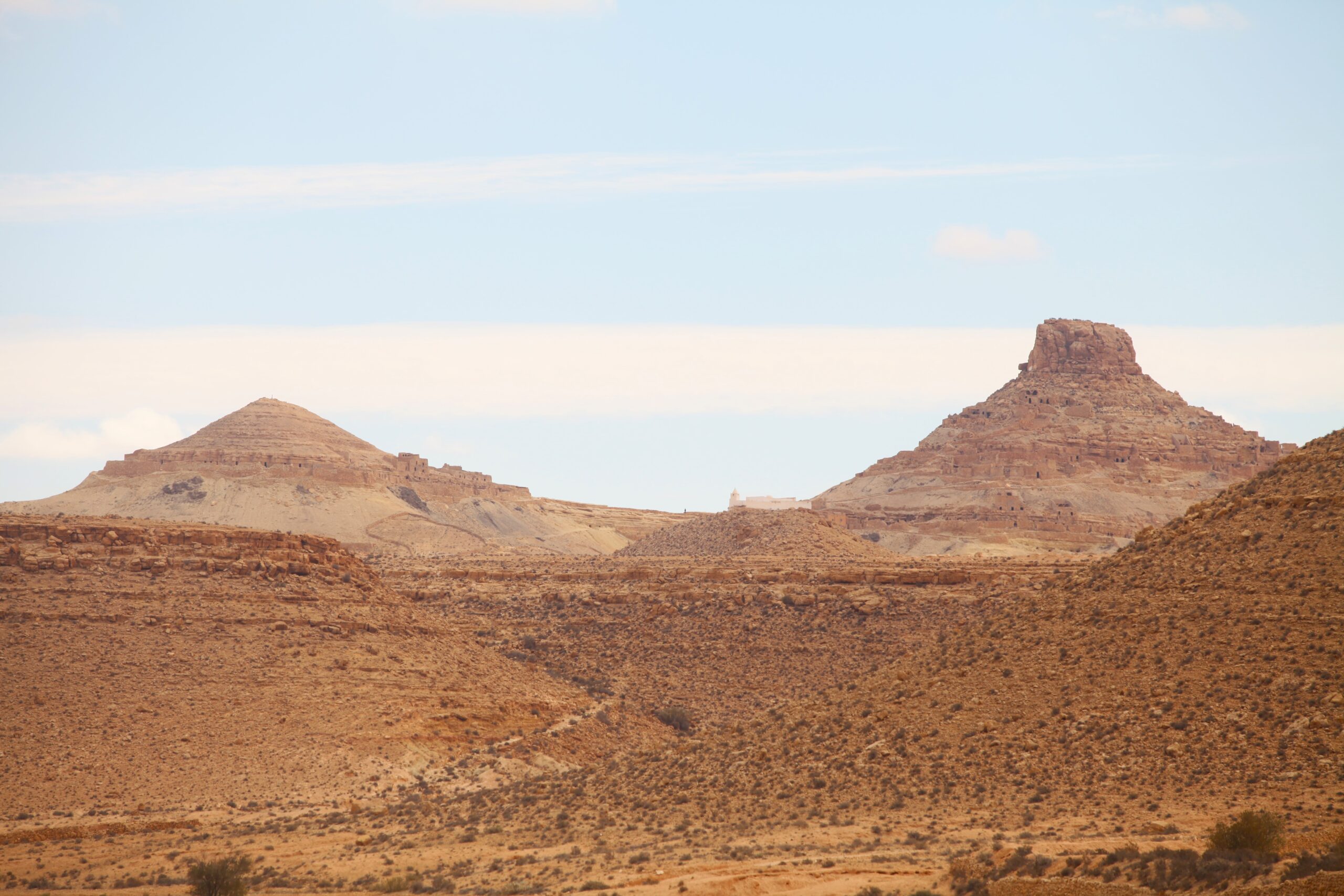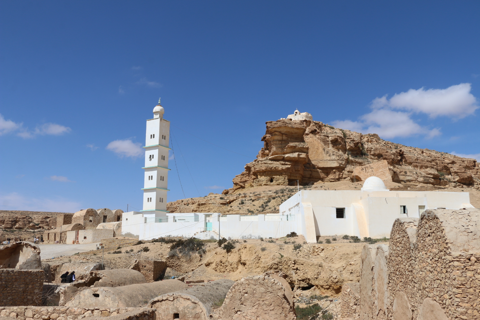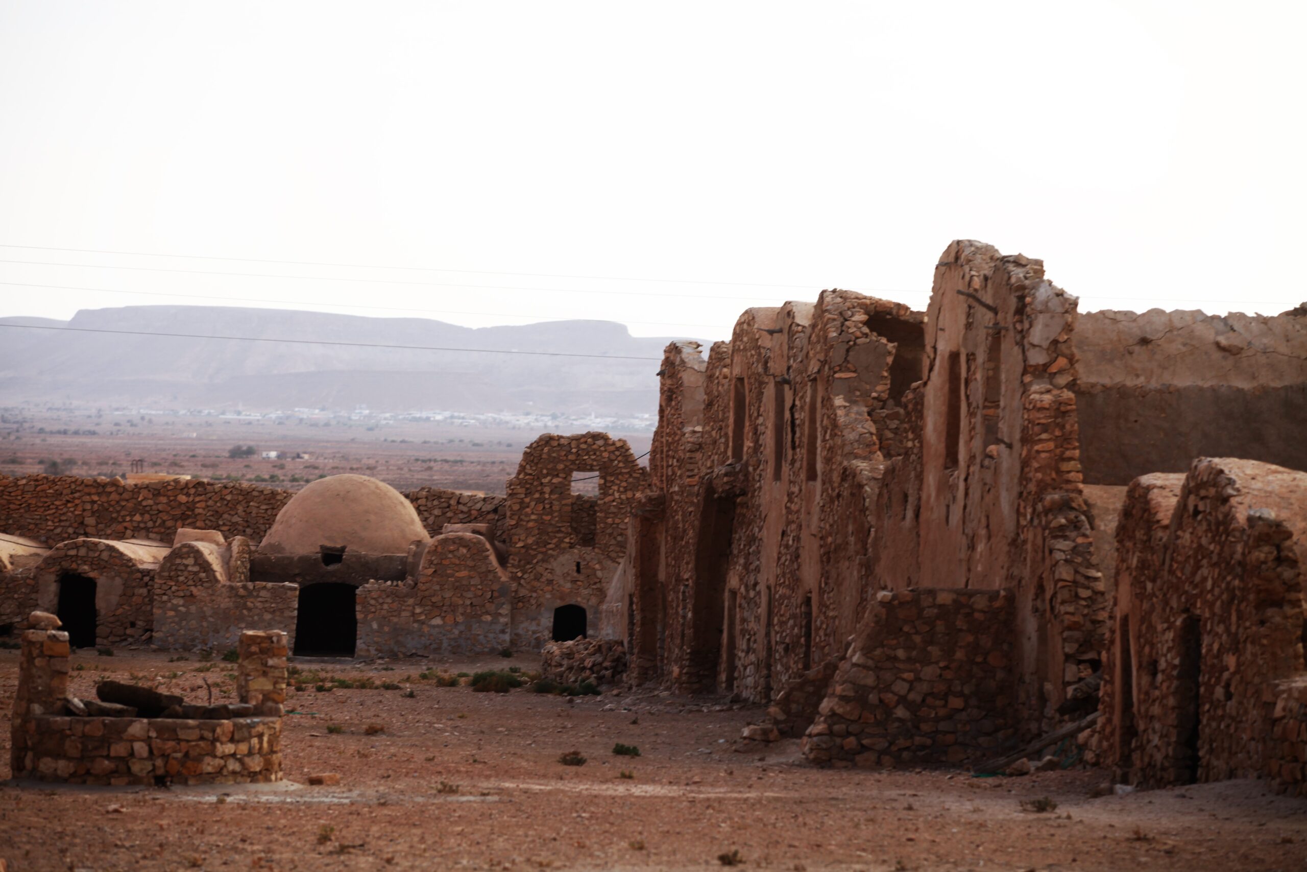 Ksar Insefri, perché sur une colline, offre une vue panoramique sur les paysages arides de la région. Construit en pierre et en terre, il est constitué de cellules de stockage empilées, illustrant une adaptation parfaite au climat désertique. Il symbolise l’organisation sociale et la solidarité des anciens habitants.